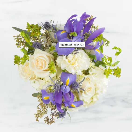 This beautiful arrangement contains roses, carnations, blue iris, and other seasonal blooms. APPROXIMATE DIMENSIONS: 8" L x 8" W x 8" H