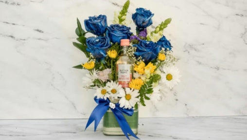 A vibrant bouquet of striking blue roses, cheerful daisies, bold snapdragons, and sunny yellow poms, bringing a lively and colorful burst of beauty