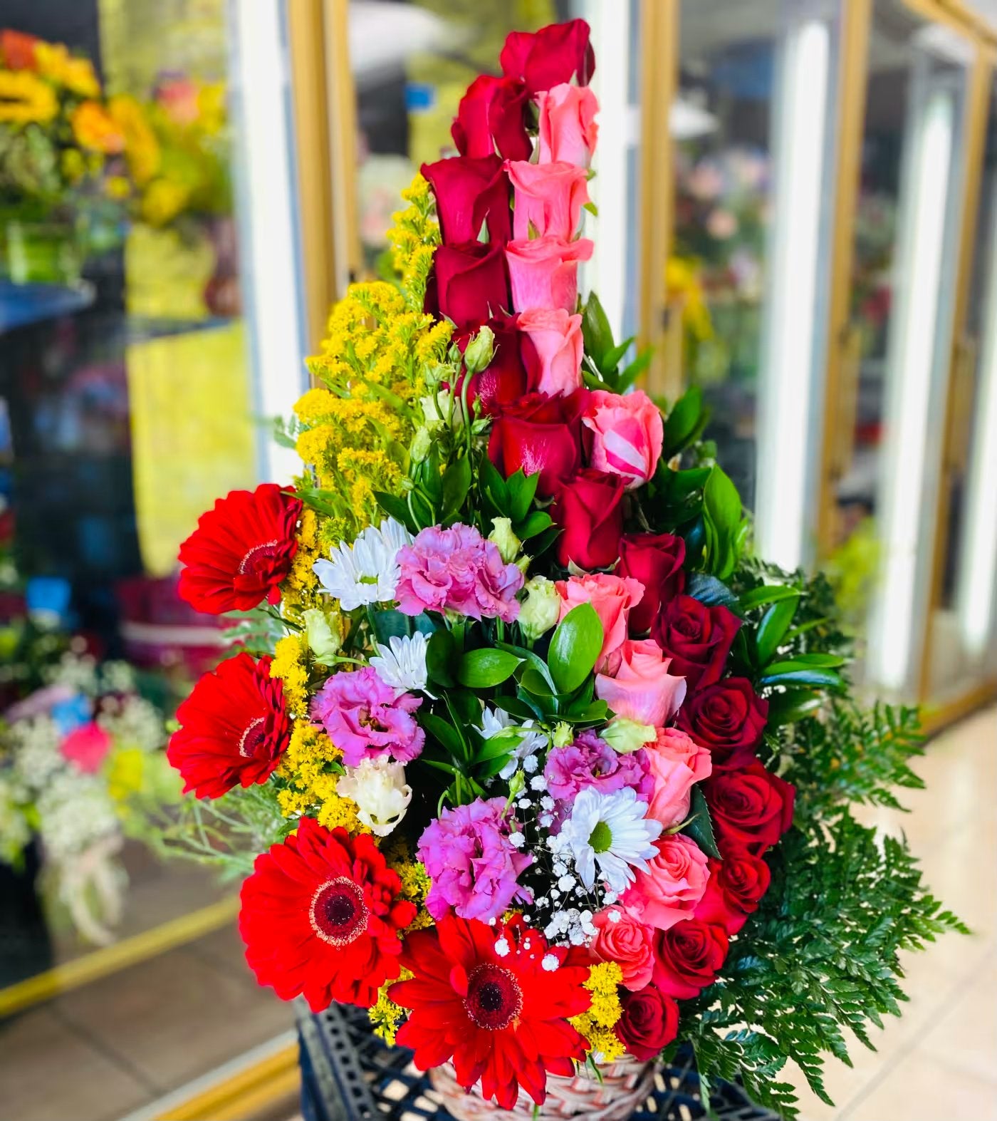 This large beautiful arrangement is designed in a basket filled with a gorgeous combination of pink and red roses, gerber daisies, carnations lavishly designed in a S-shape.