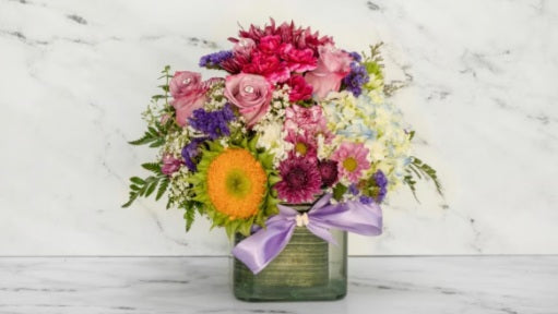 This arrangement features a delightful bouquet composed of sunflowers, roses, statice, hydrangeas, poms, and baby's breath. This vibrant arrangement radiates warmth and charm, blending bold and delicate blooms into a stunning visual harmony.