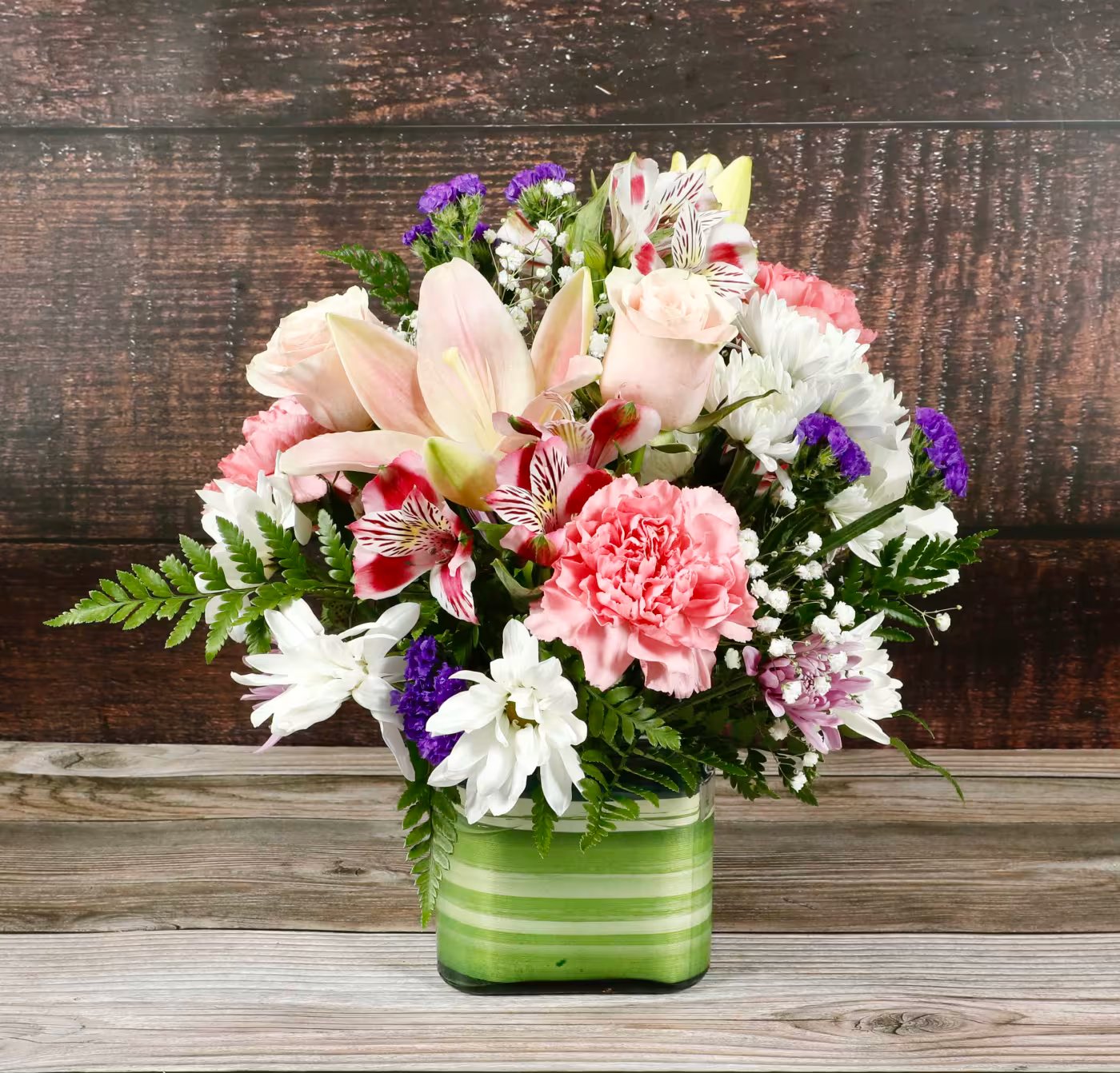 Pastel perfection includes pink carnations, peach roses, pink lilies, pink alstroemerias, white pom pom cushions purple statice artfully arranged in a glass square vase.