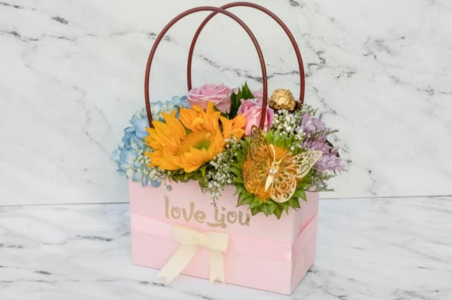The arrangement exudes rustic elegance, featuring radiant sunflowers, lush hydrangeas, and deep chocolate roses. Artfully presented in a stylish bag, it creates a charming blend of earthy tones and vibrant hues, perfect for any occasion