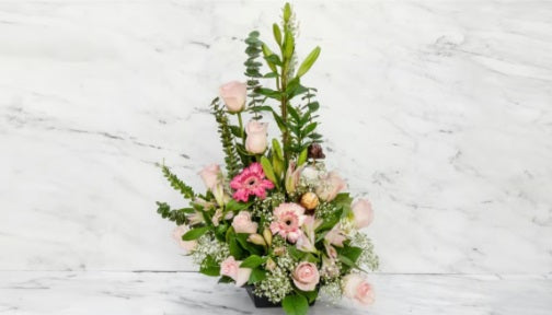 A lavish arrangement of pink daisies, elegant lilies, soft pink roses, and fresh eucalyptus is accented with assorted greenery, creating a stunning display of natural beauty