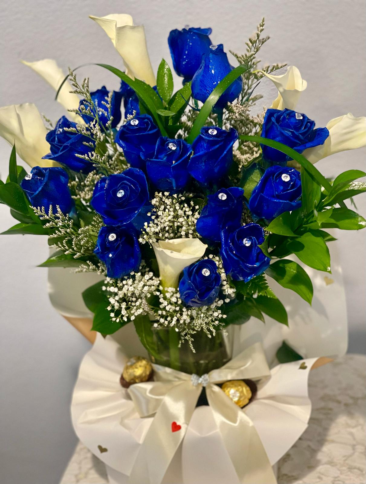 A breathtaking masterpiece of elegance and sophistication! This stunning bouquet features a striking combination of deep sapphire blue roses and pristine white calla lilies, symbolizing mystery, grace, and everlasting love. Each blue rose is adorned with a delicate rhinestone, adding a shimmering touch of luxury. Accented with soft baby’s breath and lush greenery, this arrangement is placed in a glass vase wrapped in a lavish ivory satin bow, embellished with charming heart details and golden chocolates.