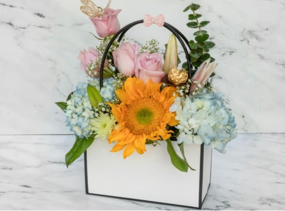 The arrangement exudes rustic elegance, featuring radiant sunflowers, lush hydrangeas, and deep chocolate roses. Artfully presented in a stylish bag, it creates a charming blend of earthy tones and vibrant hues, perfect for any occasion arranged in a white clutch purse.