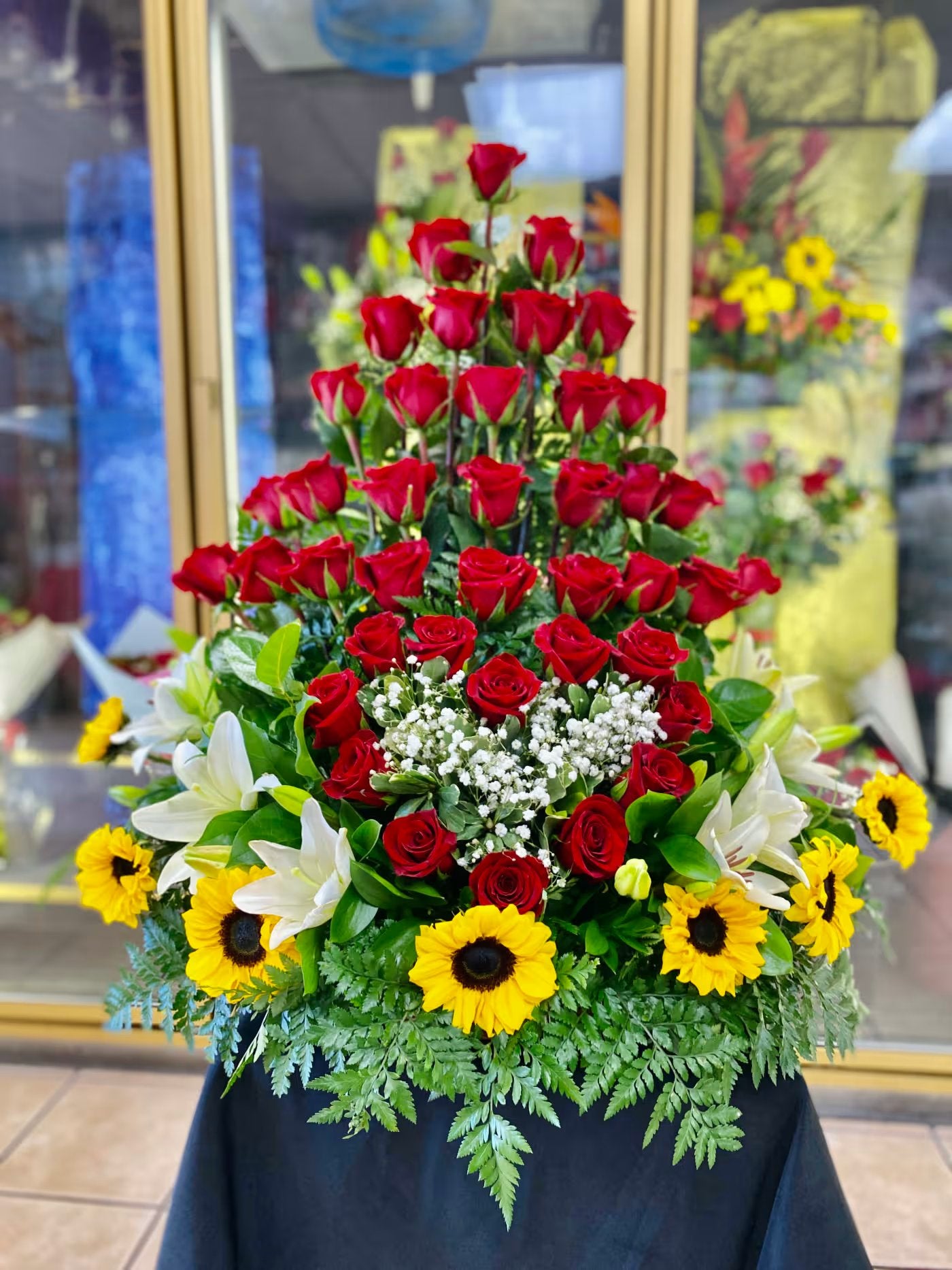 This arrangement simply shows the meaning of “I love you to the moon and back!” Filled with red roses, sunflowers, white lilies arranged in large basket, with a red rose heart design in the middle.