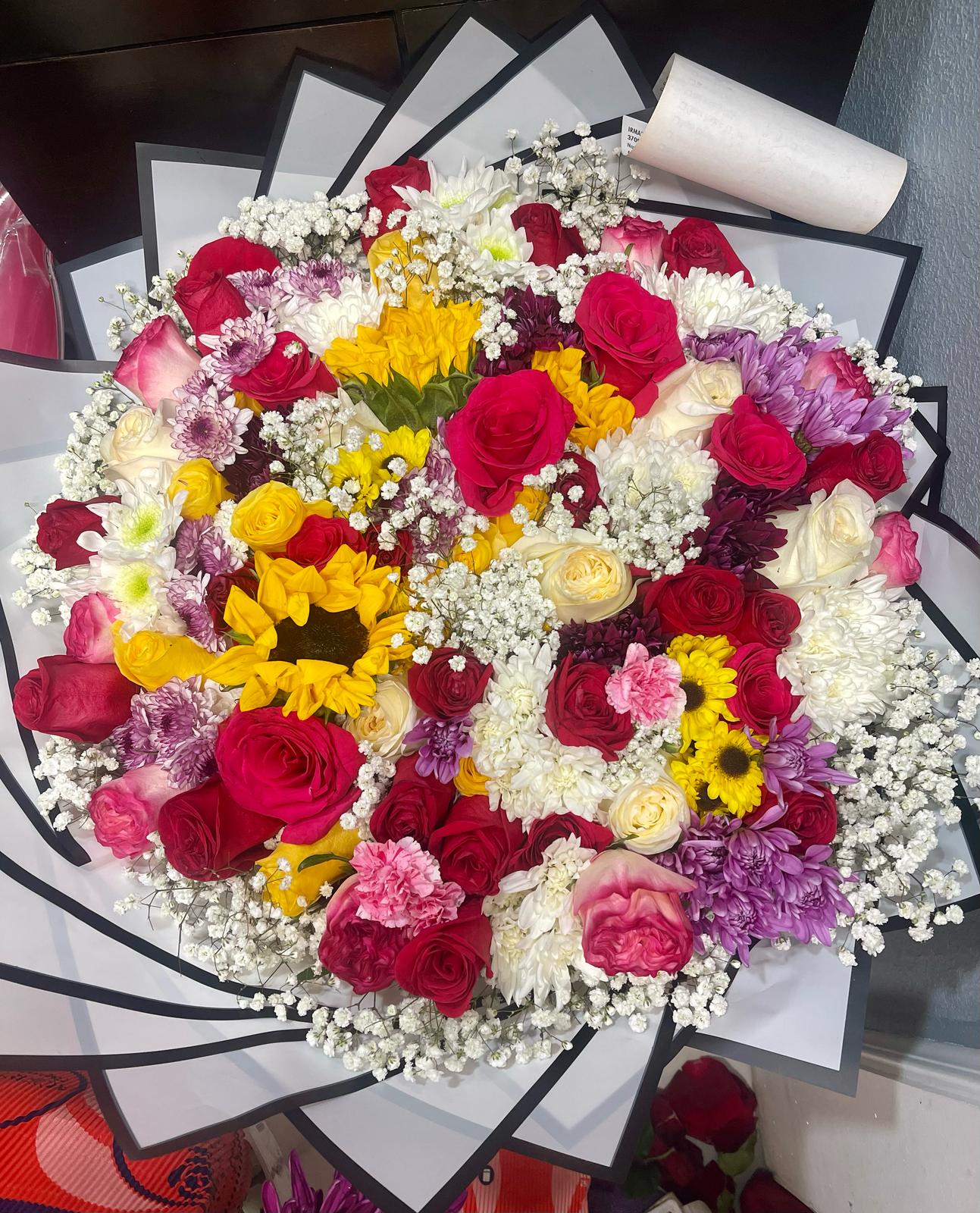 A breathtaking explosion of colors, this grand bouquet is a celebration of joy and warmth! Featuring radiant sunflowers, deep red roses, soft pink carnations, and a blend of vibrant daisies, chrysanthemums, and baby’s breath, this arrangement is a true masterpiece of floral artistry. The bold contrast of bright yellows, passionate reds, and soft purples creates a mesmerizing display, perfect for birthdays, celebrations, or simply to brighten someone's day. A stunning bouquet that radiates happiness and love!