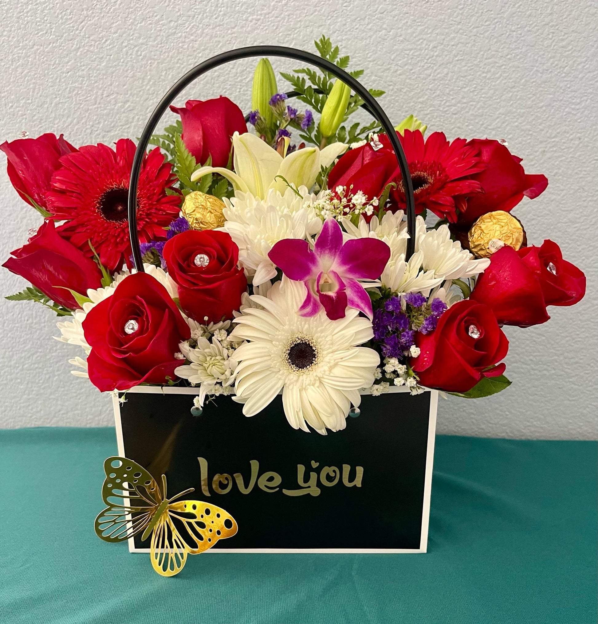 This stunning floral arrangement is a vibrant expression of love and affection. Set in an elegant black gift box with the heartfelt message "Love You" in gold lettering, this bouquet bursts with a striking mix of red roses, deep red gerbera daisies, white chrysanthemums, and delicate purple orchids. Accented with shimmering rhinestones, lush greenery, and golden-wrapped chocolates, this arrangement is a perfect combination of romance and sophistication. A golden butterfly embellishment adds a final touch of charm, making it an ideal gift for any special occasion.