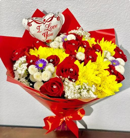 Red Roses, yellow pom Poms beautiful arranged filled with baby’s breath and assorted greenery.