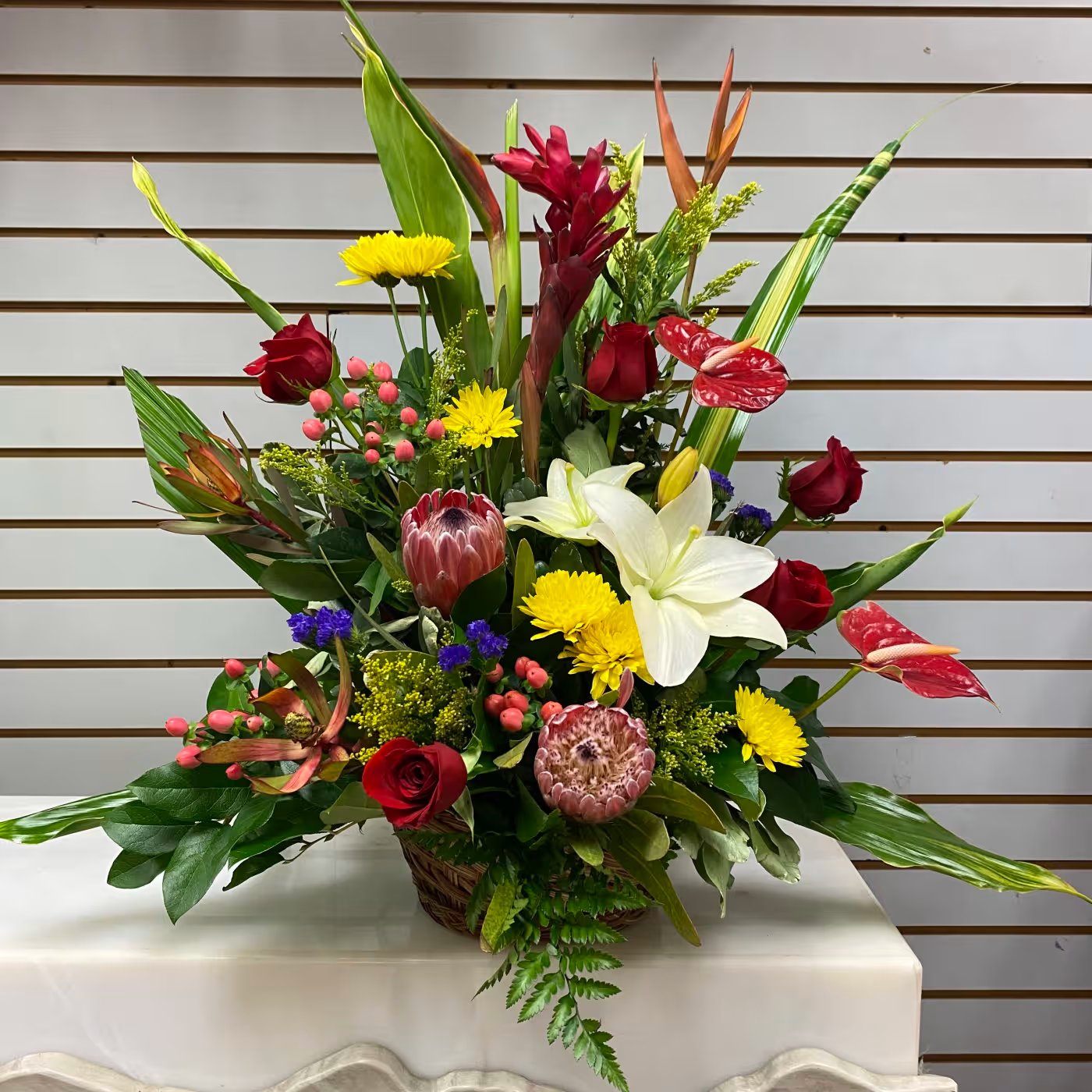 Mixed tropical with roses & lilies